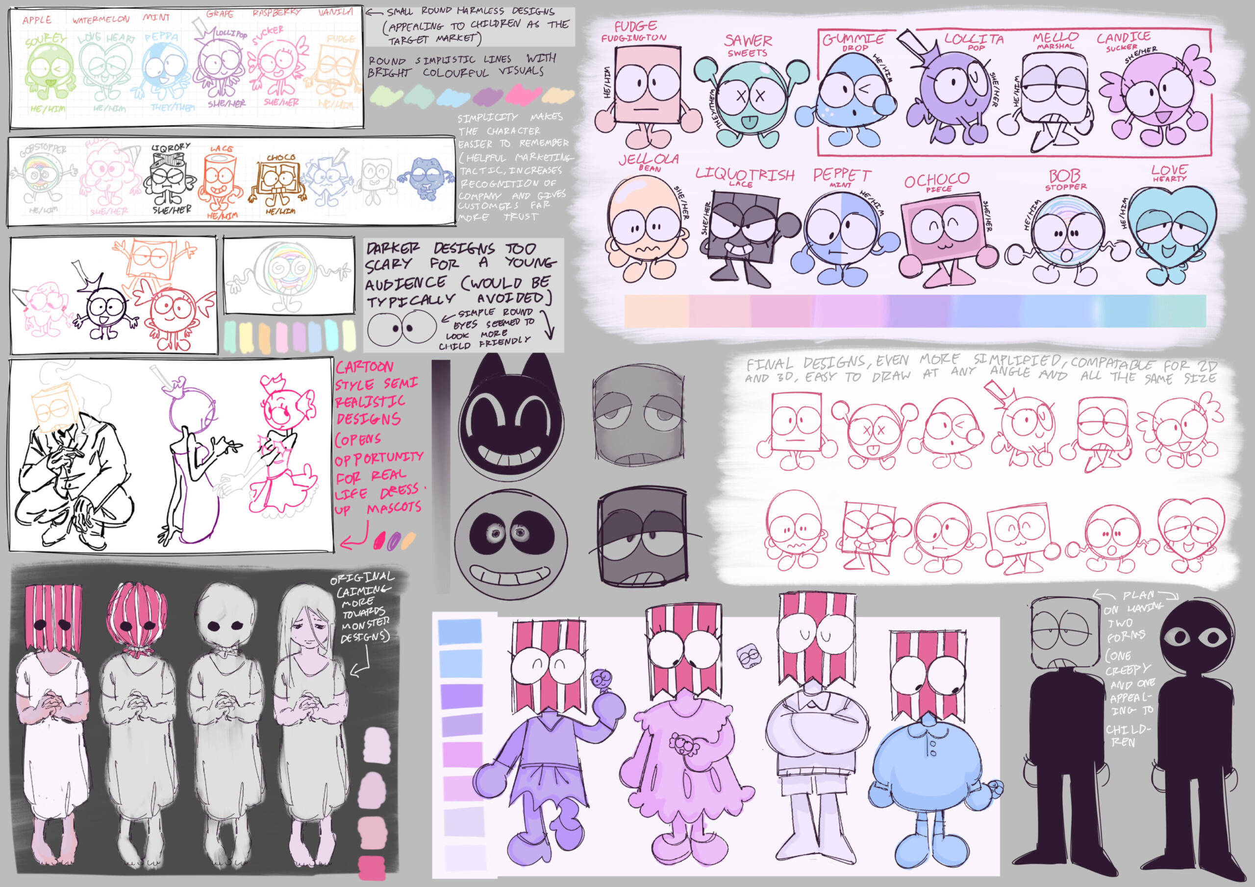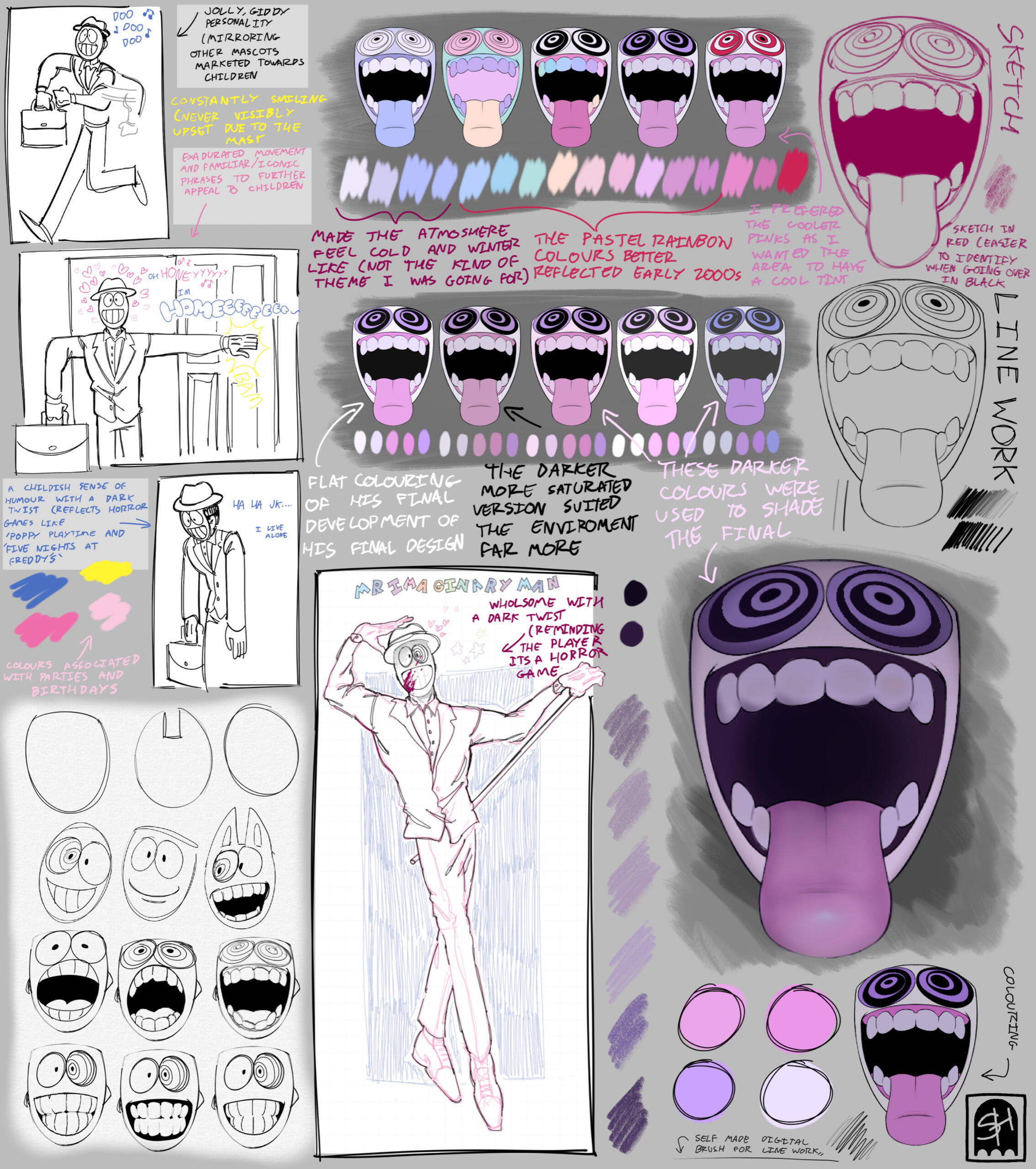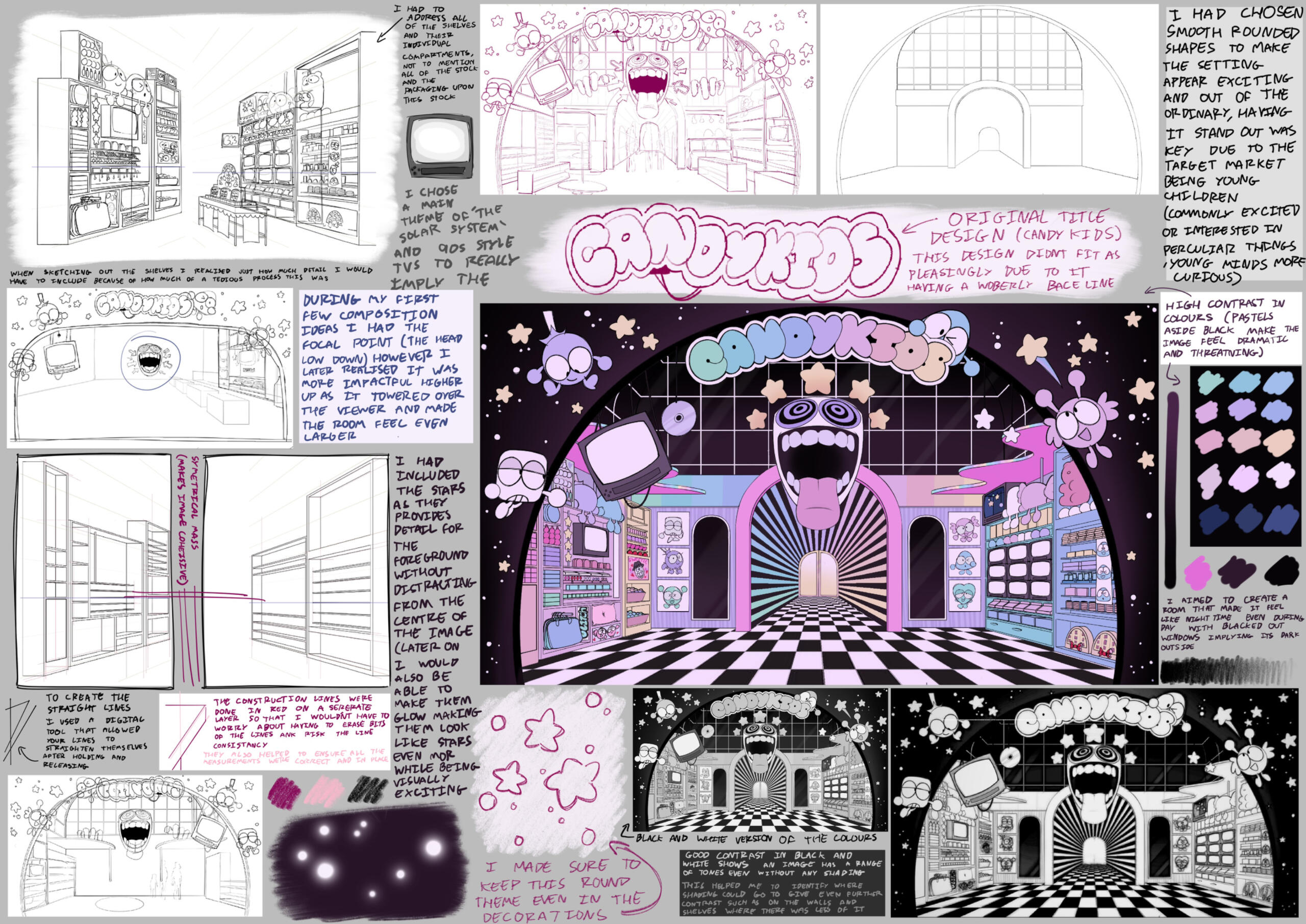 Moving onto colouring, I change the background to a colour that compliments the overall pallet followed by colour tests which help me to decide the final colour pallet. For this image in particular, I chose cool tinted colours to achieve my goal of creating a cold eerie setting despite the playful design. I finish off by rendering, I commonly render with very dark yet saturated colours as well as black.