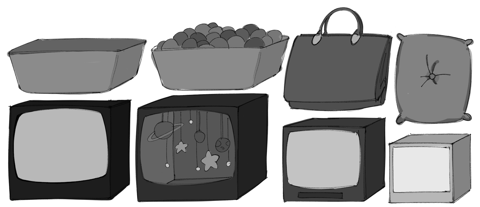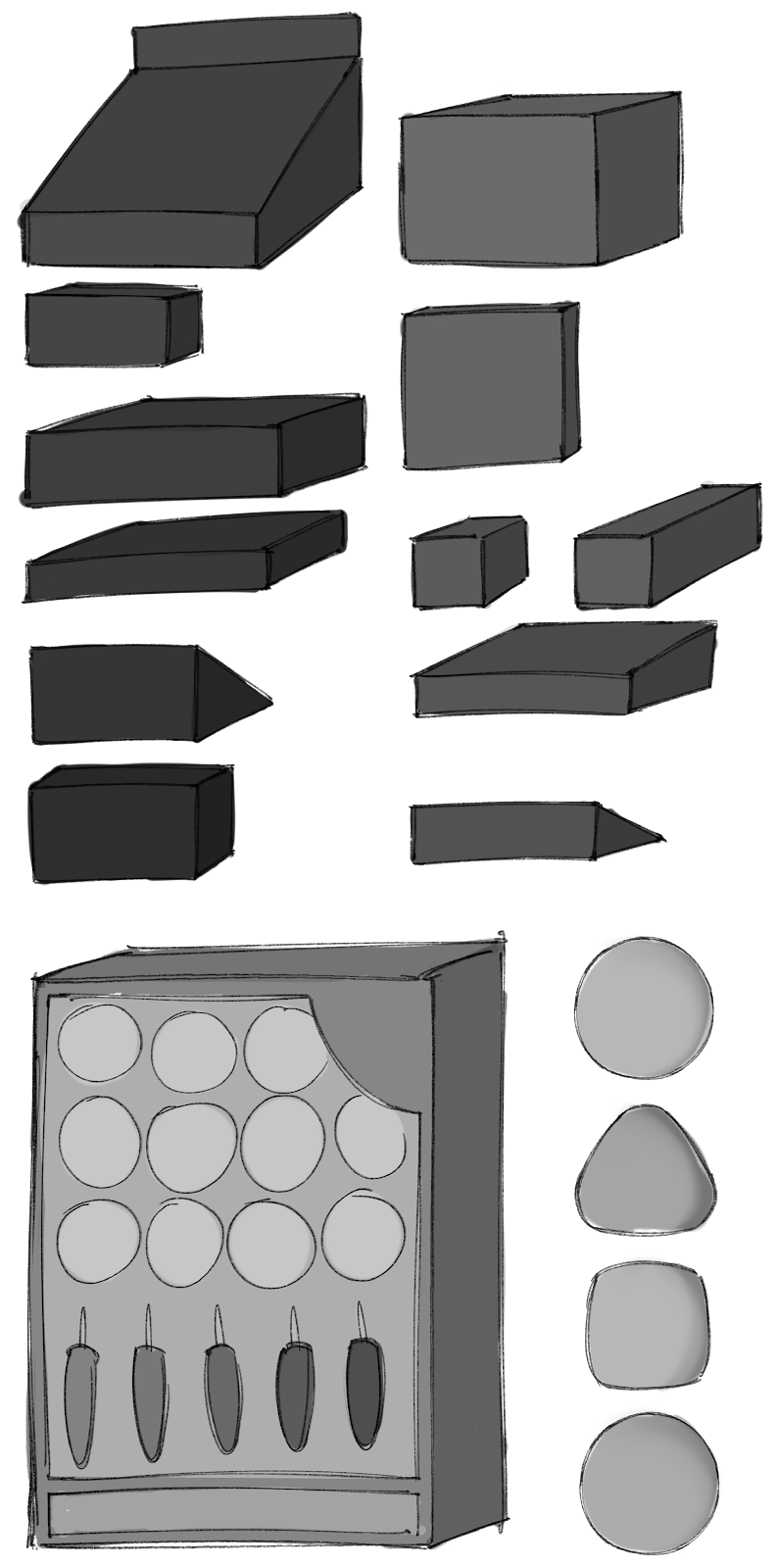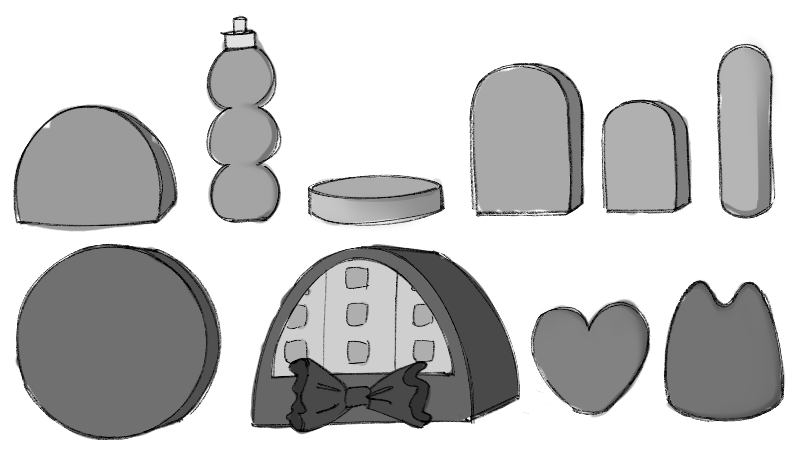Moving onto colouring, I change the background to a colour that compliments the overall pallet followed by colour tests which help me to decide the final colour pallet. For this image in particular, I chose cool tinted colours to achieve my goal of creating a cold eerie setting despite the playful design. I finish off by rendering, I commonly render with very dark yet saturated colours as well as black.
