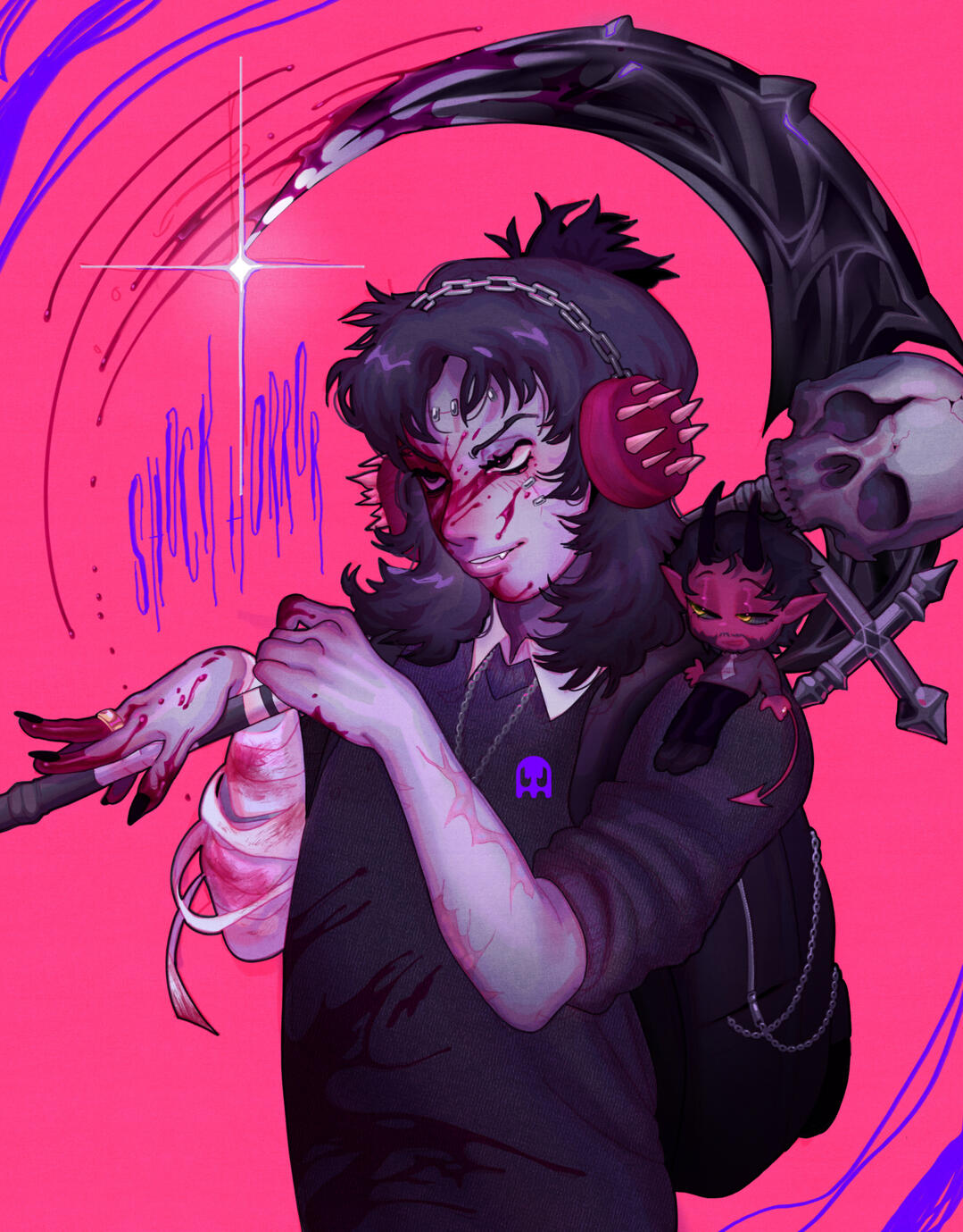 | When it comes to my artwork I have a particular interest in the horror genre, inspired by artists like Junji Ito and Tim Jacobus, using dark tones and bright colours. ♥︎ |